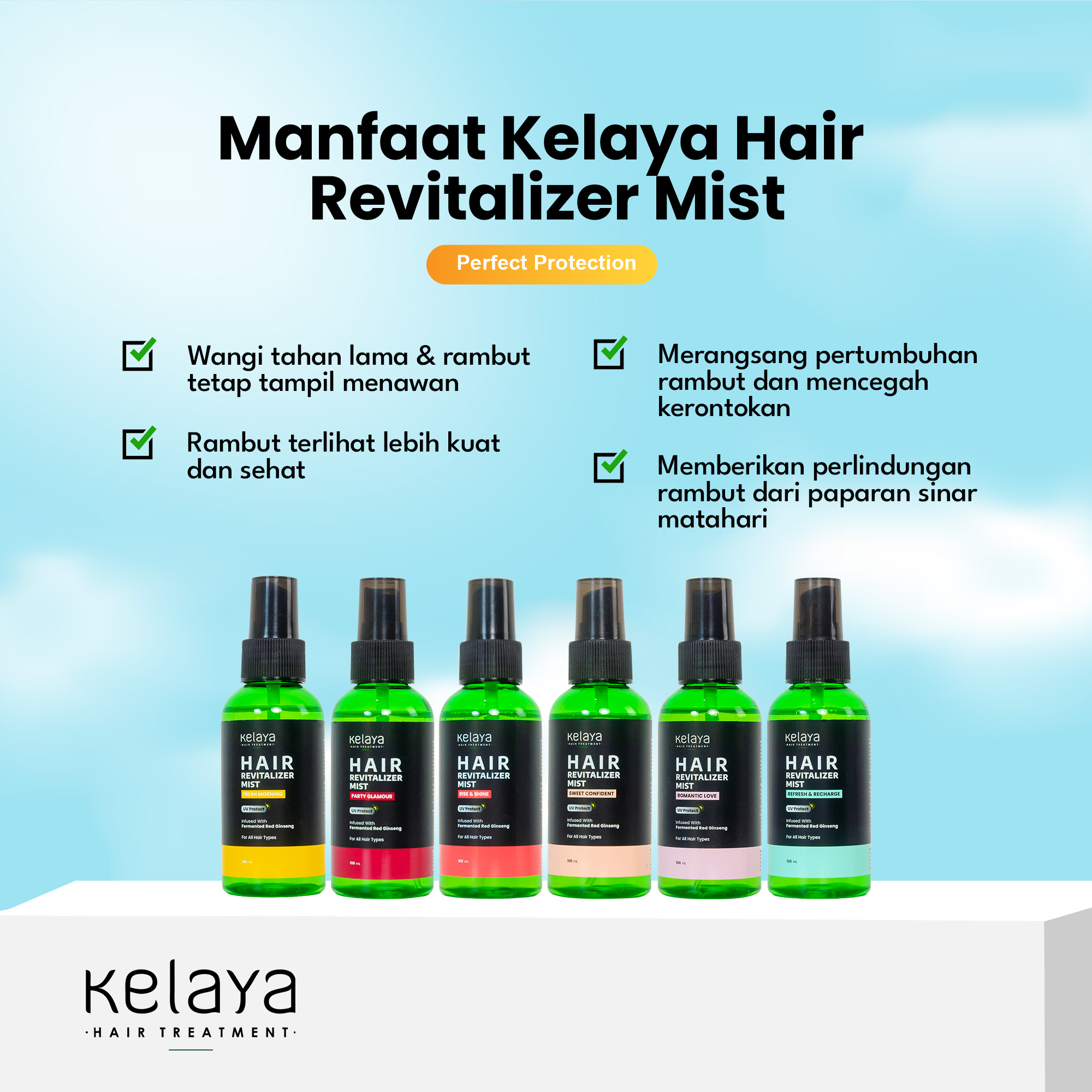 1️⃣ Kelaya Hair Revitalizer Mist Refresh and Recharge: Dengan sensasi keharuman segar citrus, aroma yang segar dan ringan cocok untuk segala kegiatan outdoor dan cuaca cerah.